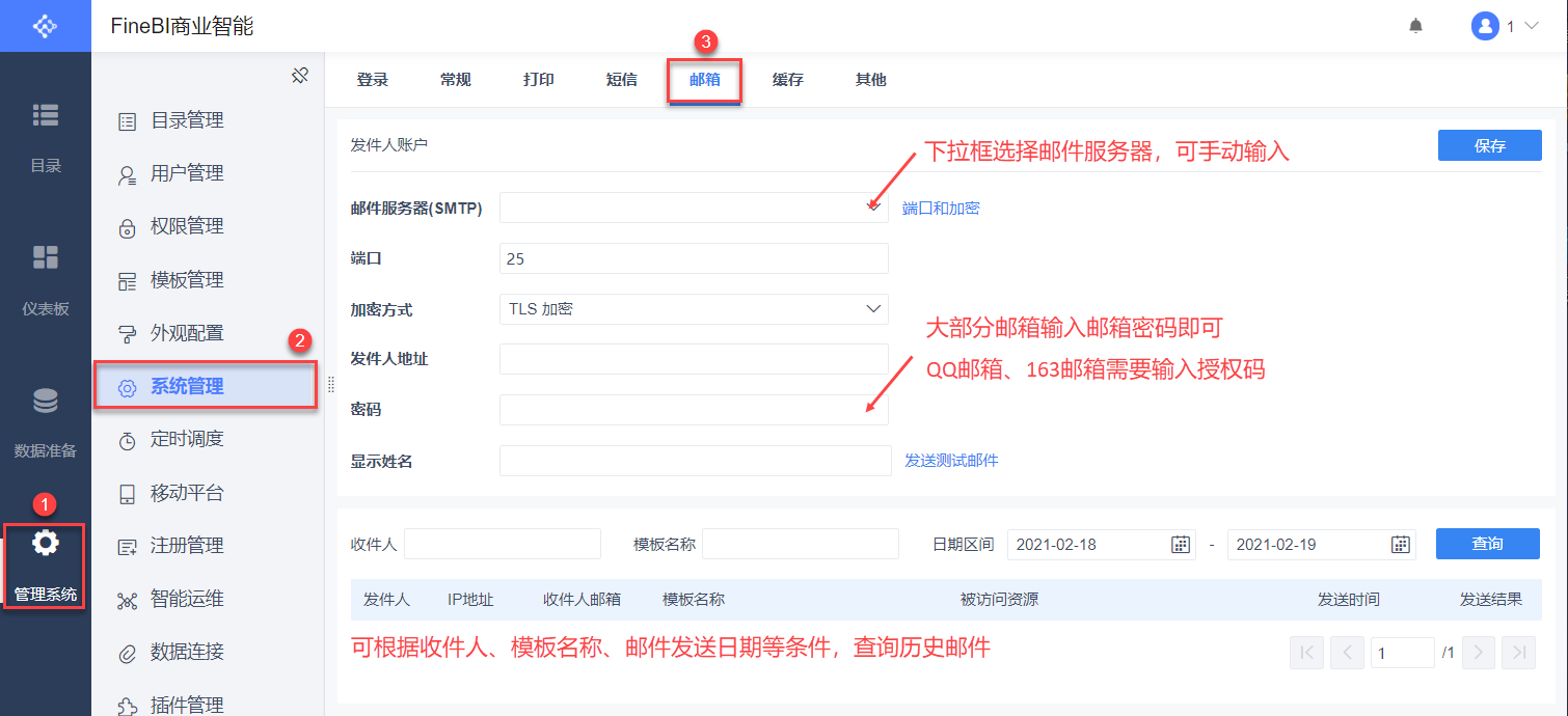 点击「管理系统>系统管理>邮箱」,可以设置发件人账户,可查询历史邮件,如下图所示: