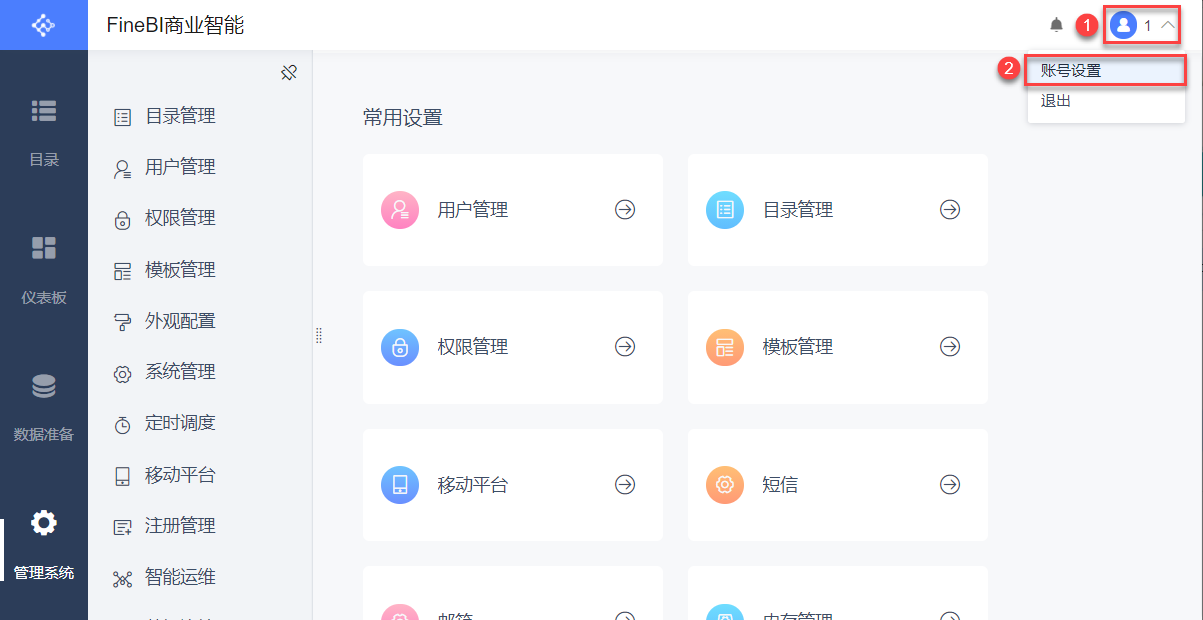 用户登录数据决策系统,点击右上角姓名,点击「账号设置」,如下图所示: