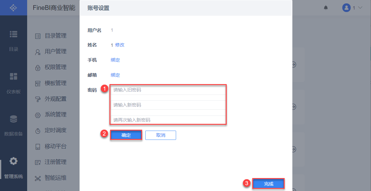 按照提示修改密码,点击「确定」,点击「完成」,密码修改成功。