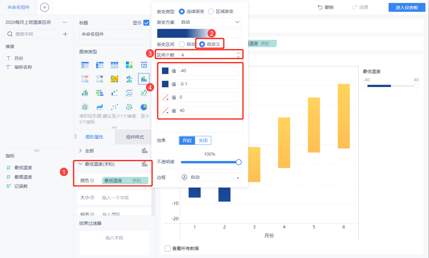 最低温度颜色设置:将最低温度指标拉到最低温度的颜色下,设置颜色为连续渐变,自定义四个区间(-40,-0.1,0,40),将前两个区间设置为相同颜色,后两个区间的颜色设置为透明。