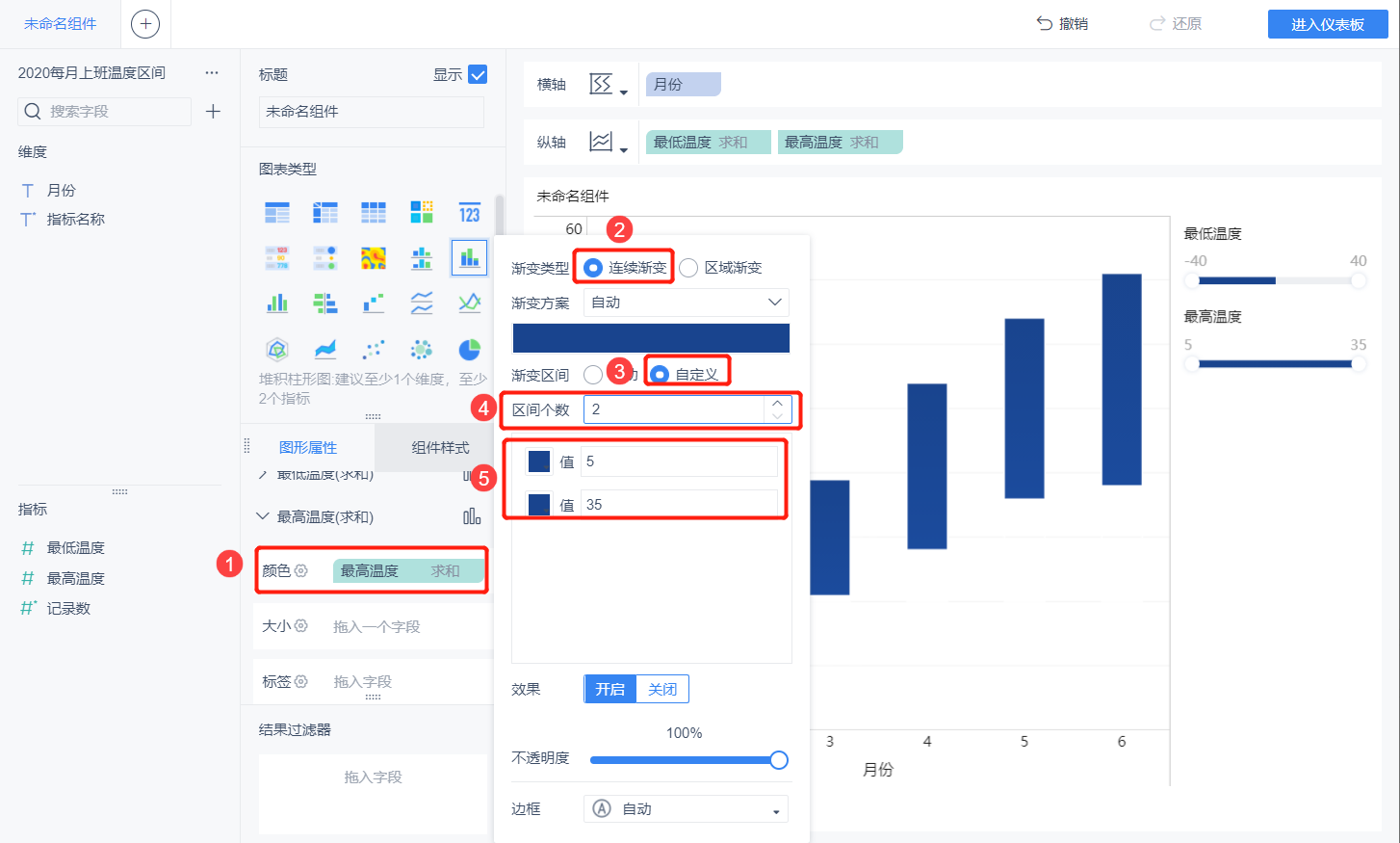 最好温度颜色设置:将最高温度拖入颜色,选择连续渐变,自定义,区间颜色选择为相同颜色,如下图所示