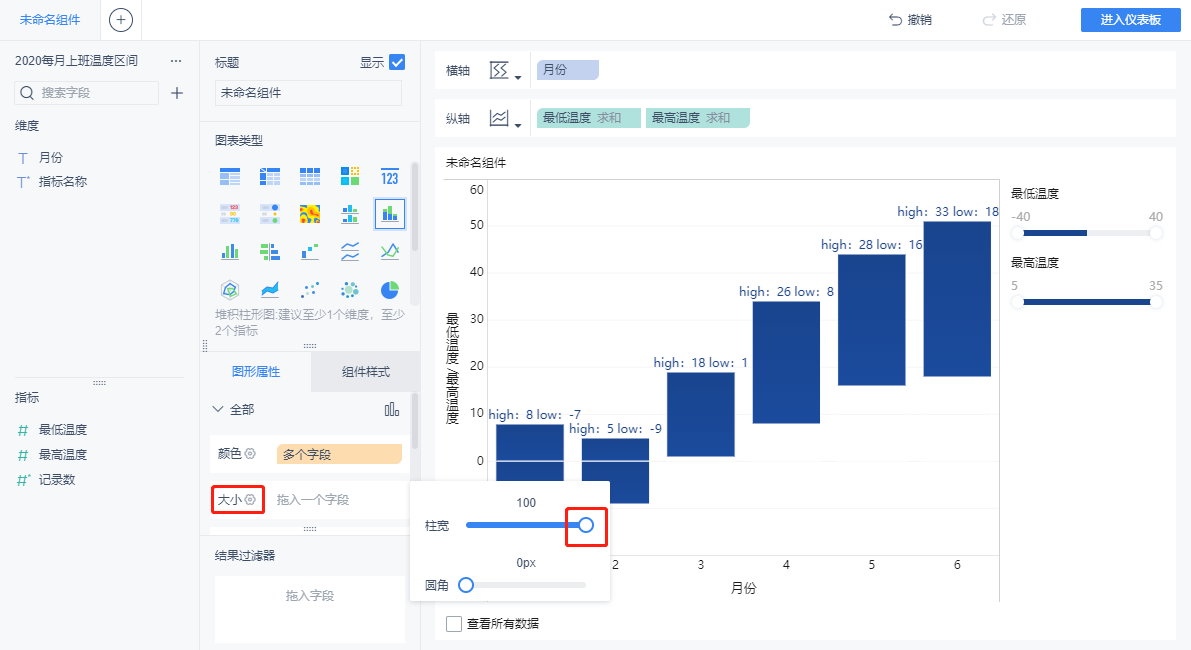 图标类型选择「堆积柱形图」,将月份拉到横轴,最低温度和最高温度拉到纵轴,如下图所示: