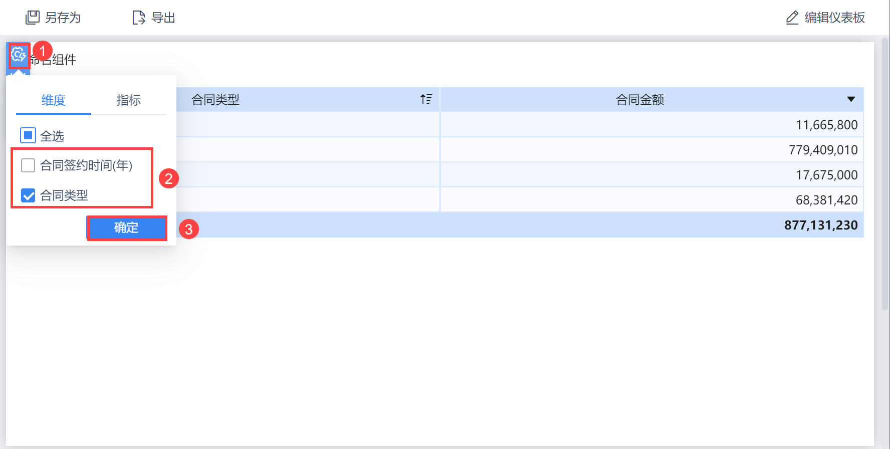 若用户在查看仪表板时需要将合同类型作为最上级的维度,只需要拖动鼠标调整顺序,点击「确定」,如下图所示: