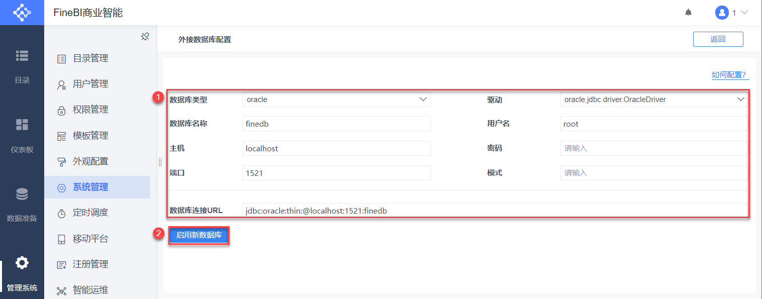 管理员登录数据决策系统,点击「管理系统>系统管理>常规>外接数据库>待配置」,如下图所示: