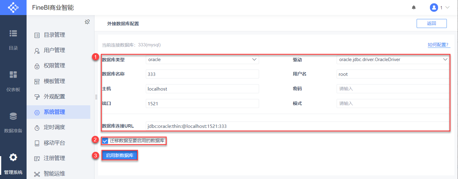 注:JAR 包版本低于 2019-05-20 时,用户配置外接数据库时只能迁移数据,不可直接启用新数据库。