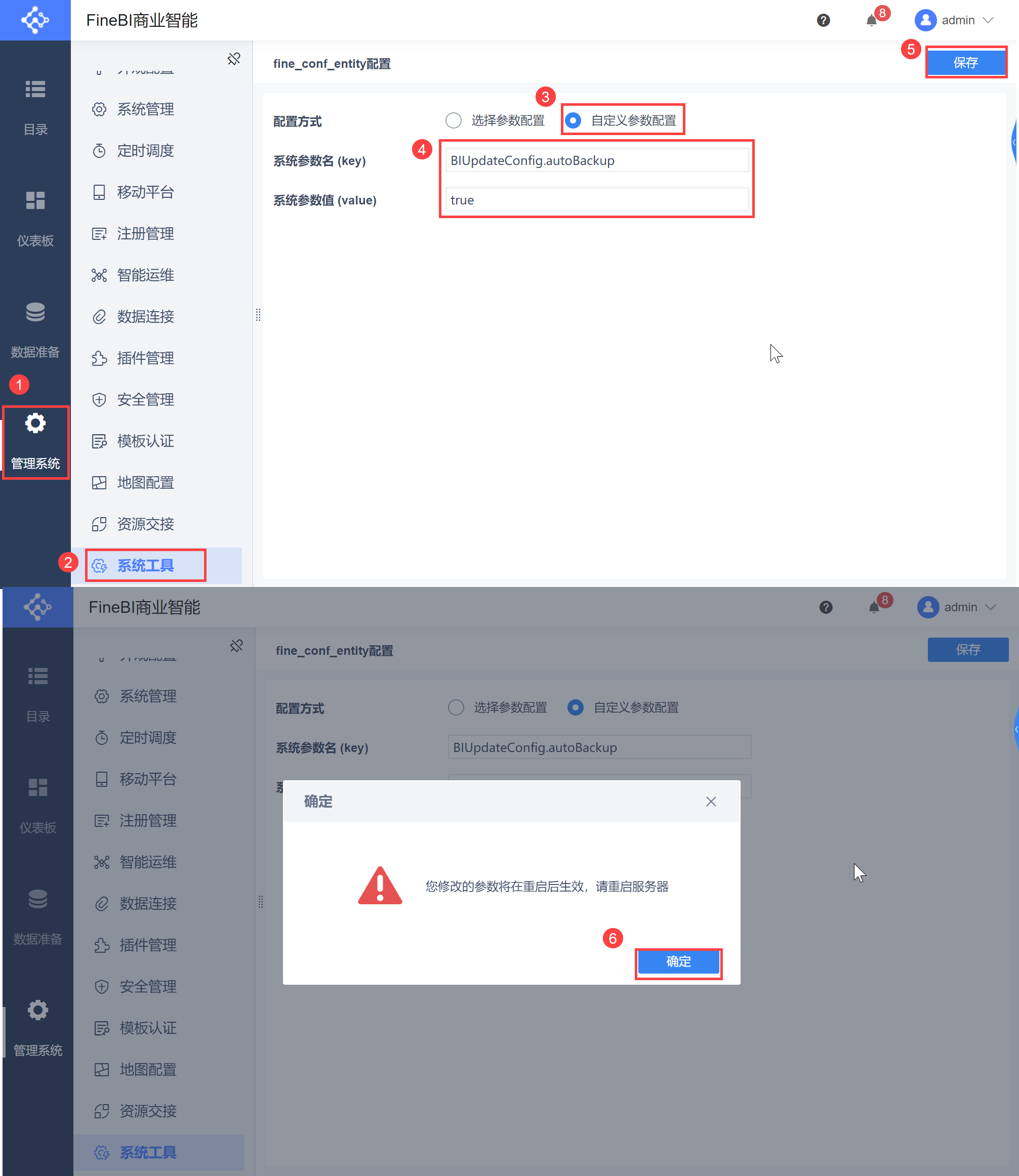 使用 FINE_CONF_ENTITY可视化配置 插件,点击「管理系统>系统工具」,选择「自定义参数配置」,输入系统参数名「BIUpdateConfig.autoBackup」和系统参数值「true」,点击保存,如下图所示: