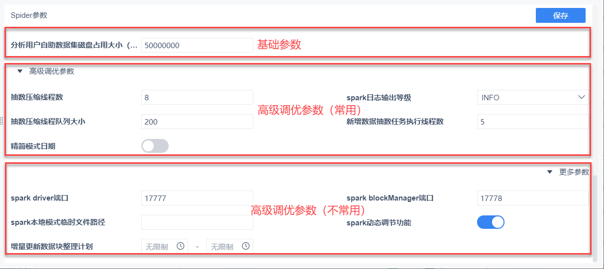 Spider 参数包含基础参数和高级调优参数,如下图所示: