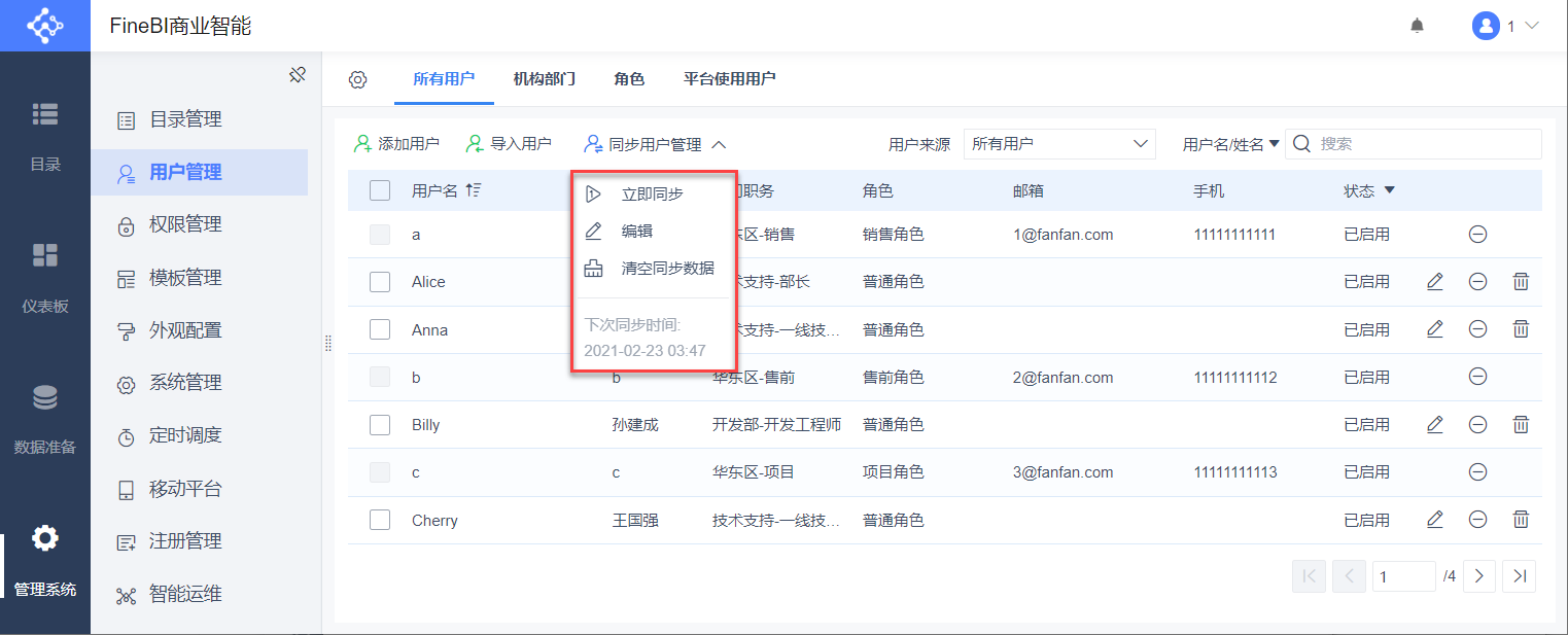 管理员登录数据决策系统,点击「管理系统>用户管理>所有用户」,点击「同步用户」。
