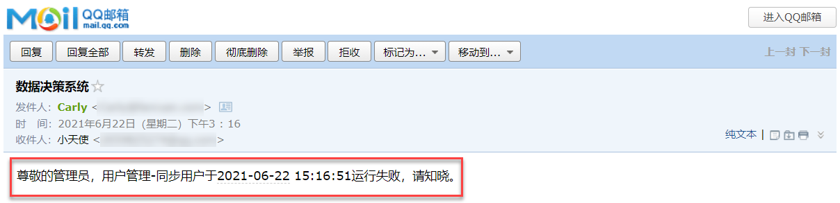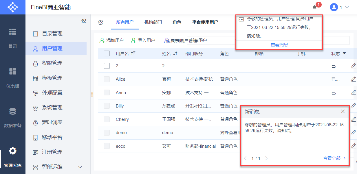 管理员登录数据决策系统,点击「管理系统>用户管理>全局设置」,配置同步失败提醒推送的接收人,点击「保存」,如下图所示: