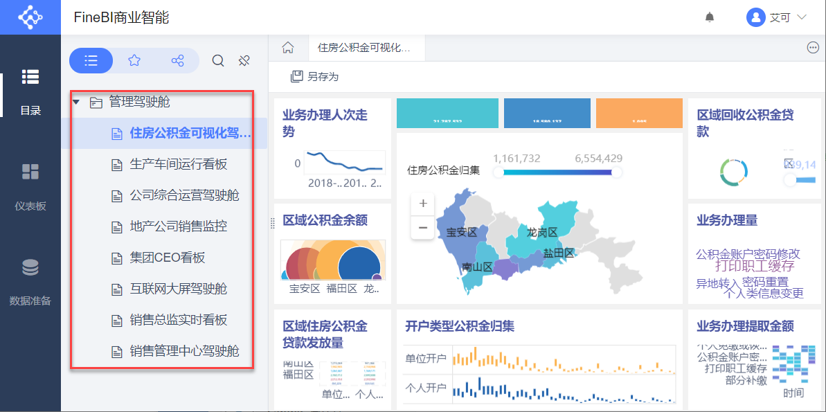财务部用户(eoco,1)登录数据决策系统,即可查看「管理驾驶舱」目录及目录下的模板。如下图所示: