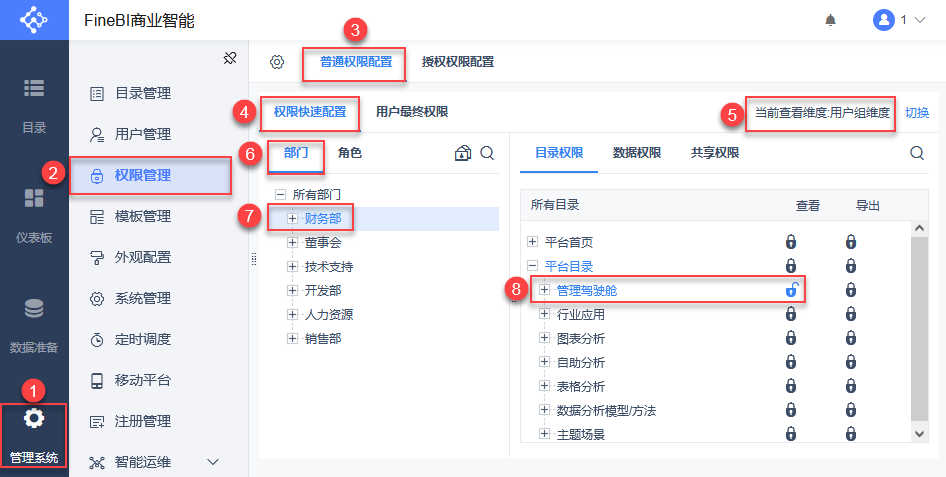 在「用户组维度」下,选择权限载体为「部门>财务部」,为「财务部」分配「管理驾驶舱」的目录查看权限,如下图所示: