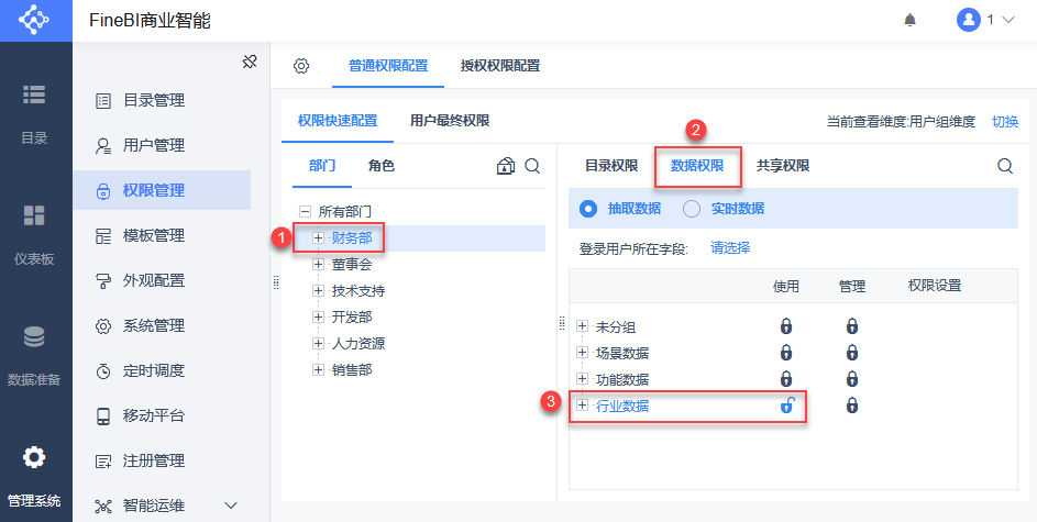 管理员登录数据决策系统,点击「管理系统>权限管理>普通权限配置>权限快速配置」。