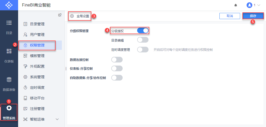 超级管理员登录数据决策系统,点击「管理系统>权限管理>全局设置」,开启「分级授权」按钮,点击「保存」。如下图所示: