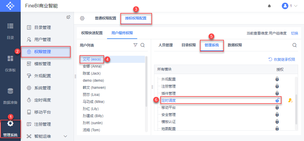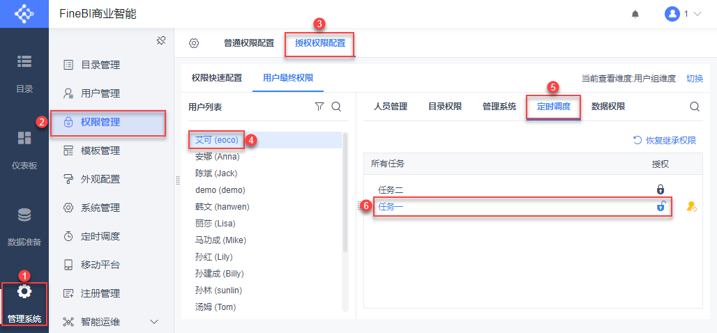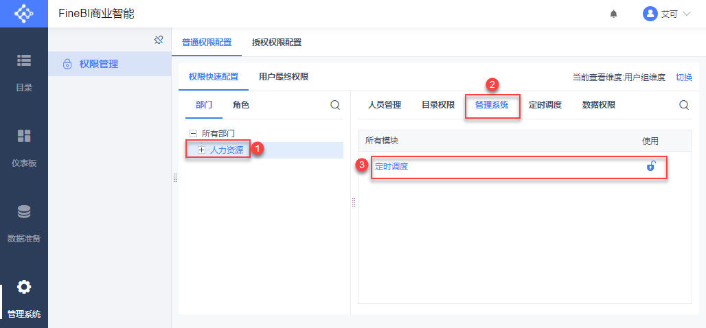 用户 eoco 登录数据决策系统,点击「管理系统>权限管理>普通权限配置」,可给部门「人力资源」配置系统下所有定时调度任务的管理权限。如下图所示: