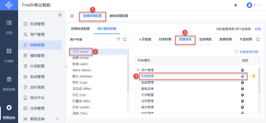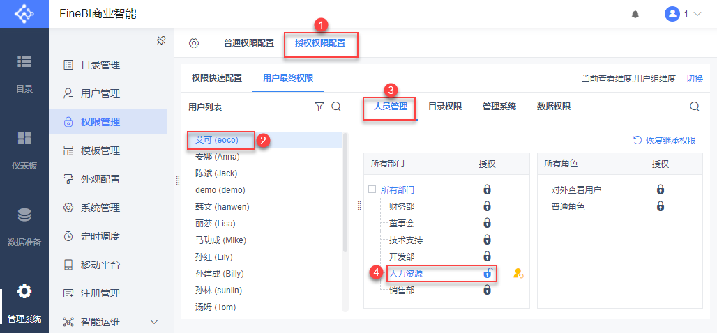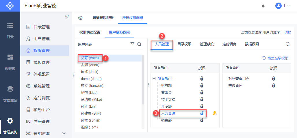 管理员登录数据决策系统,点击「管理系统>权限管理>普通权限配置」,选择权限载体「部门/角色/用户」,本示例选择用户 eoco。