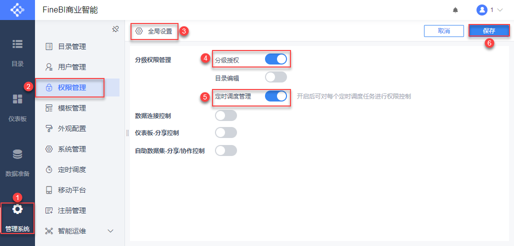 超级管理员登录数据决策系统,点击「管理系统>权限管理>全局设置」,开启「分级授权」按钮,开启「定时调度管理」按钮,点击「保存」。如下图所示: