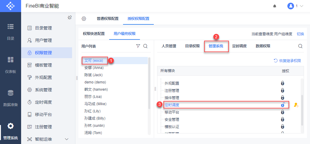 选择「管理系统」Tab,为 eoco 配置模块「定时调度」的「授权」权限,如下图所示:
