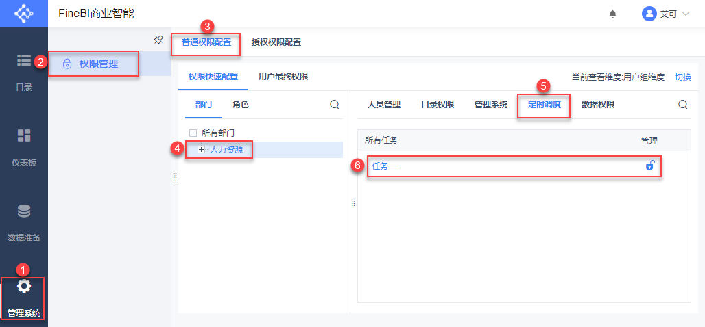 用户 eoco 登录数据决策系统,点击「管理系统>权限管理>普通权限配置」,可给部门「人力资源」配置有权限的定时调度任务「任务一」的管理权限。如下图所示: