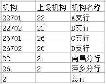 机构表:包含了银行总行、分行、支行,及对应的「机构码」和「上级机构码」,如下图所示: