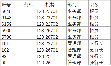 用户权限表:包含了银行职员的用户账号、密码、所属机构码、部门及职务,如下图所示:
