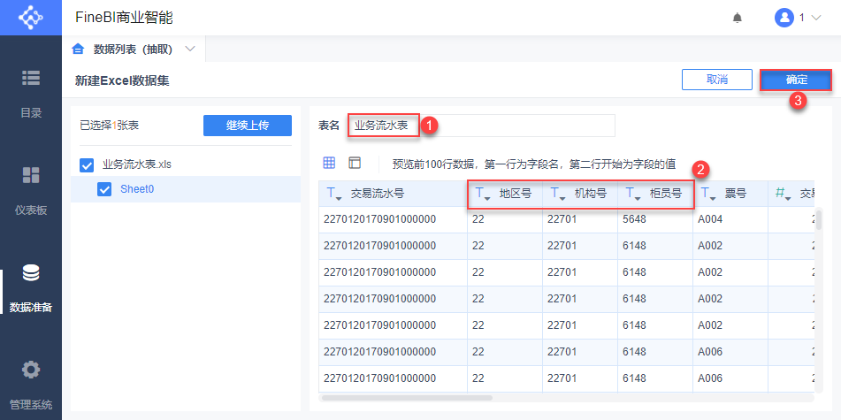 2)在业务包中添加 Excel 数据集「业务流水表」,请手动修改「地区号」、「机构号」和「柜员号」字段格式为「文本」,如下图所示:
