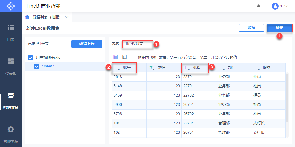 3)在业务包中添加 Excel 数据集「用户权限表」,请手动修改「账号」和「机构」字段格式为「文本」,如下图所示: