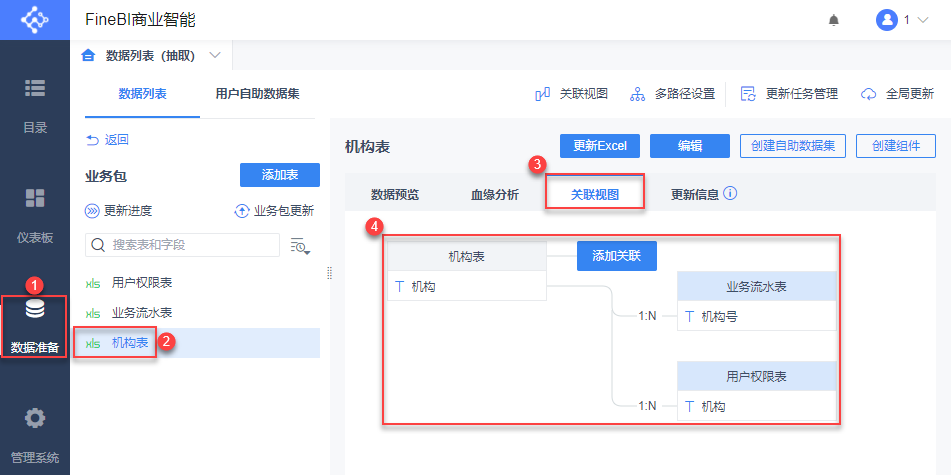 点击「数据准备」,进入业务包,选择「机构表」,点击「关联视图」,为「机构表」、「用户权限表」和「业务流水表」配置关联关系并更新数据表。如下图所示: