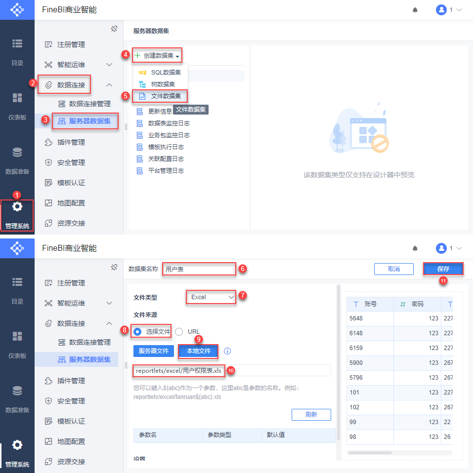 数据集名称为「用户表」,文件类型选择「Excel」,选择第二章准备的「用户权限表」,点击「保存」,如下图所示: