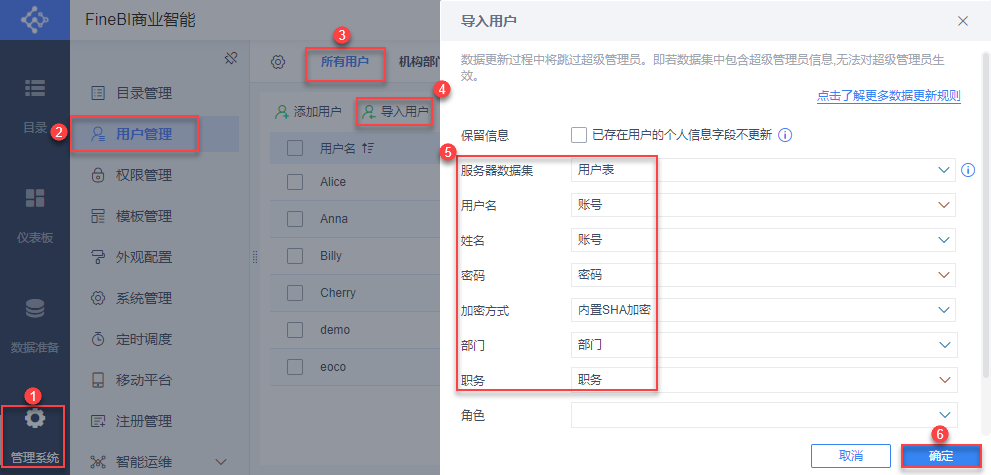 | 2 | 导入用户 | 通过服务器数据集导入数据,或者使用用户同步数据集直接同步数据库中保存的用户表 |