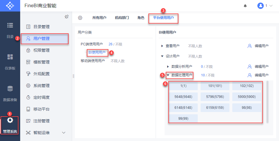 将上节导入的用户全部添加为「PC端使用用户」,如需用户有编辑和查看的权限,将所有新导入用户添加进「BI 数据分析用户」,如下图所示: