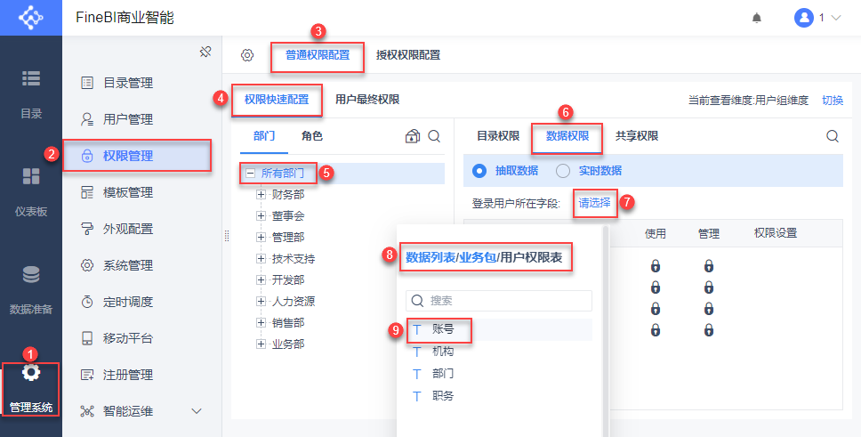 管理员登录数据决策系统,点击「管理系统>权限管理>普通权限配置」,选择权限载体「部门/角色/用户」,此处选择所有部门。
