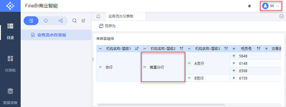 1)分行长(账号为99)显示为所有地区号为 22 (即南昌分行),查看仪表板显示包括下属地区的数据,如下图所示: