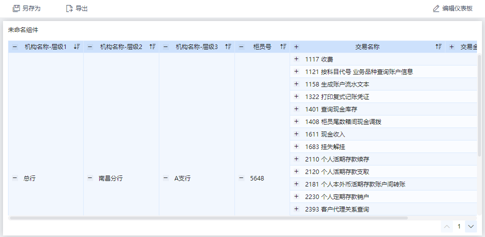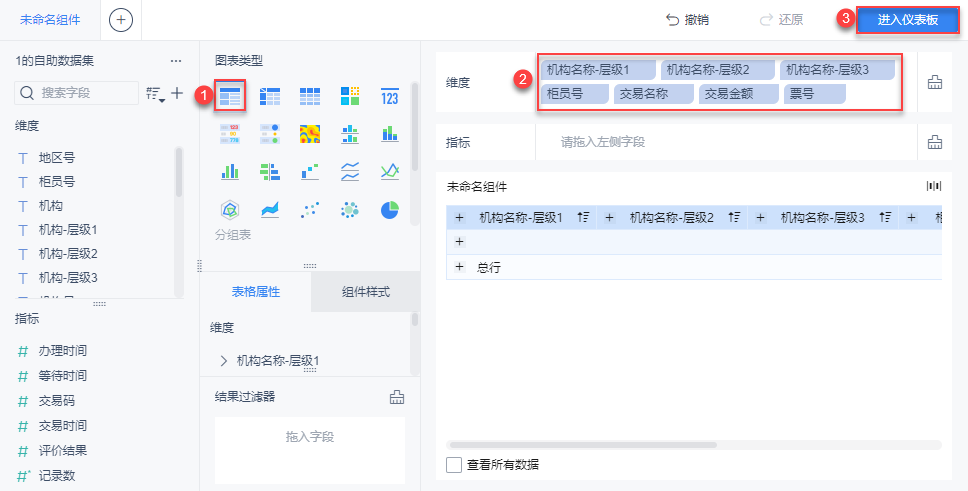 对于创建好的自助数据集,确认勾选「权限继承」。点击「创建组件」,图表类型选择「分组表」,维度依次选择「机构名称-层级1」、「机构名称-层级2」、「机构名称-层级3」、「柜员号」、「交易名称」、「交易金额」和「票号」,点击「进入仪表板」,如下图所示: