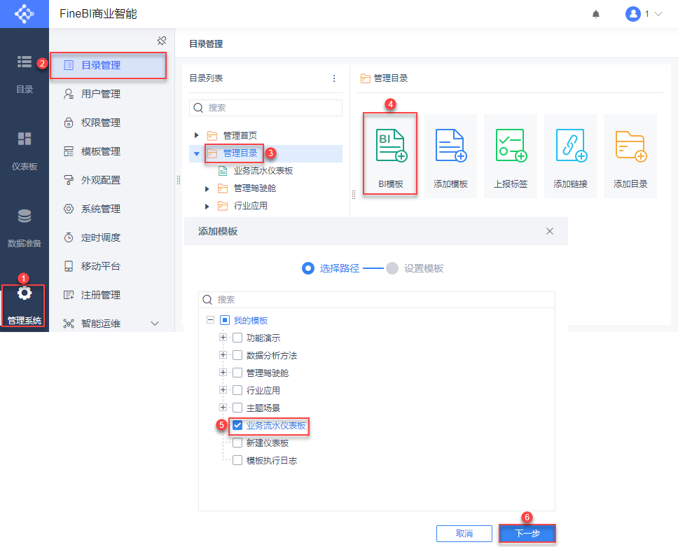 管理员登录数据决策系统,点击「管理系统>目录管理」,在目录下挂载上节创建的仪表板,如下图所示:
