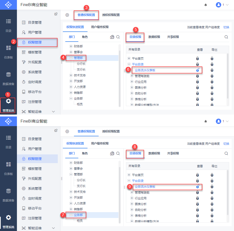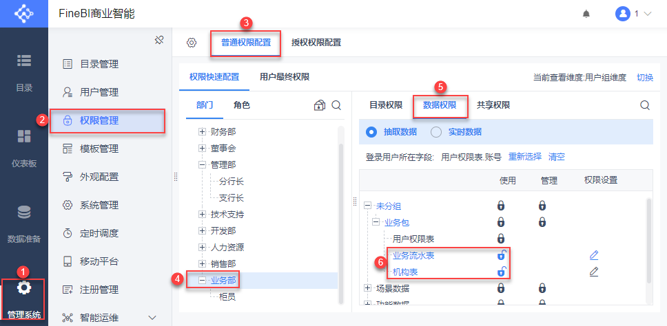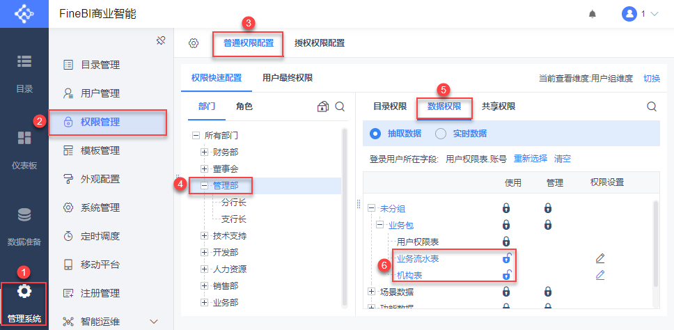管理员登录数据决策系统,点击「管理系统>权限管理>普通权限配置」,选择「管理部」和「业务部」。