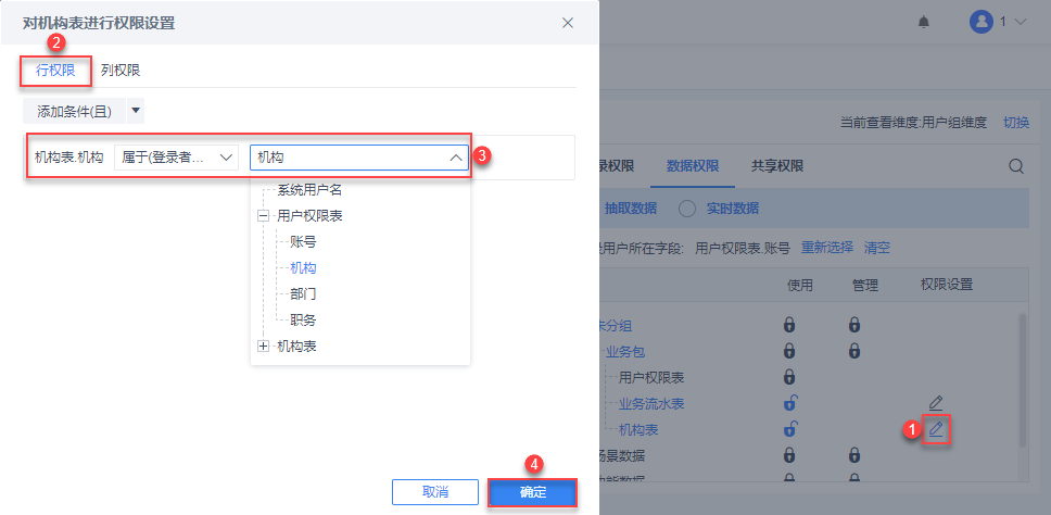 选择「机构表」后的「权限设置」按钮,添加行权限条件,使得「机构表.机构」字段「属于(登录者信息)」的「用户权限表.机构」字段,点击「确定」,如下图所示: