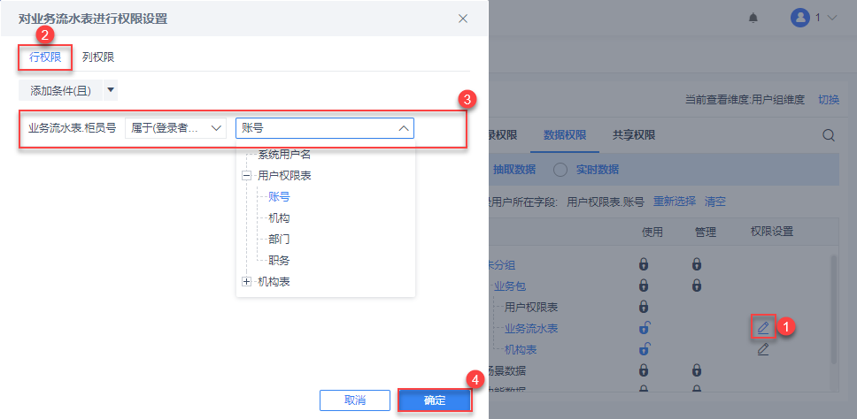 选择「业务流水表」后的「权限设置」按钮,添加行权限条件,使得「业务流水表.柜员号」字段「属于(登录者信息)」的「用户权限表.账号」字段,点击「确定」,如下图所示: