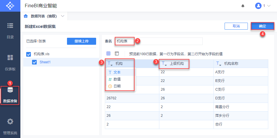 1)在业务包中添加 Excel 数据集「机构表」,请手动修改「机构」和「上级机构」字段格式为「文本」,如下图所示: