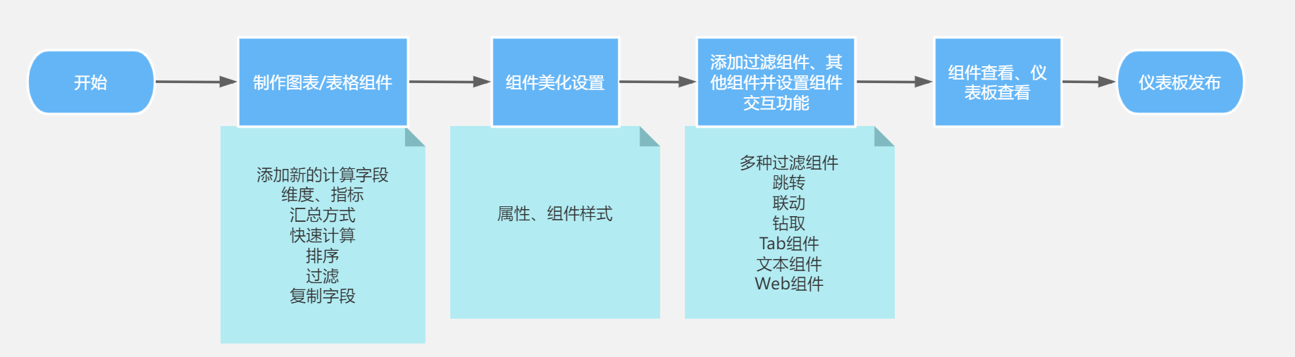 | 添加过滤组件 | 想要在查看仪表板时,可以灵活改变要过滤的值时; 需要同时对多个组件进行过滤; | 过滤组件概述 |