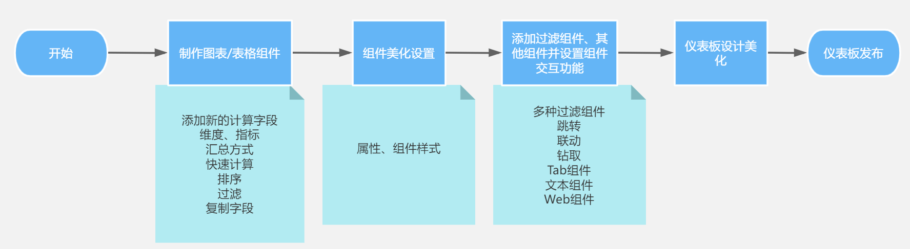 | 添加过滤组件 | 想要在查看仪表板时,可以灵活改变要过滤的值时; 需要同时对多个组件进行过滤; | 过滤组件概述 |