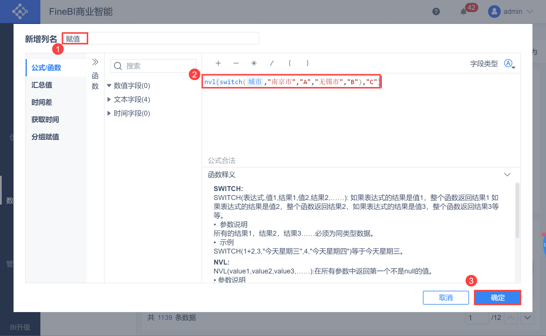 命名新增列为「赋值」,使用 SWITCH 函数将满足对应条件的字段进行赋值,输入公式nvl(switch(城市,"南京市","A","无锡市","B"),"C"),点击「确定」,如下图所示: