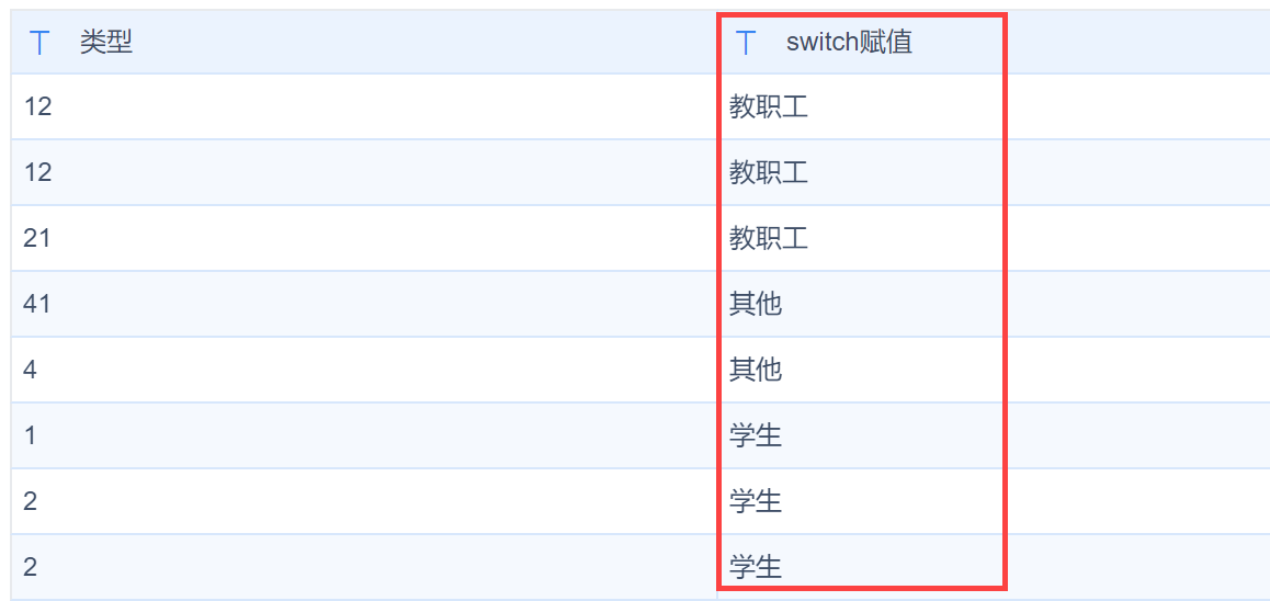 | switch(类型,"12","教职工","21","教职工","1","学生","2","学生") | 将 12、21 赋值为「教职工」,将1、2 赋值为「学生」 |