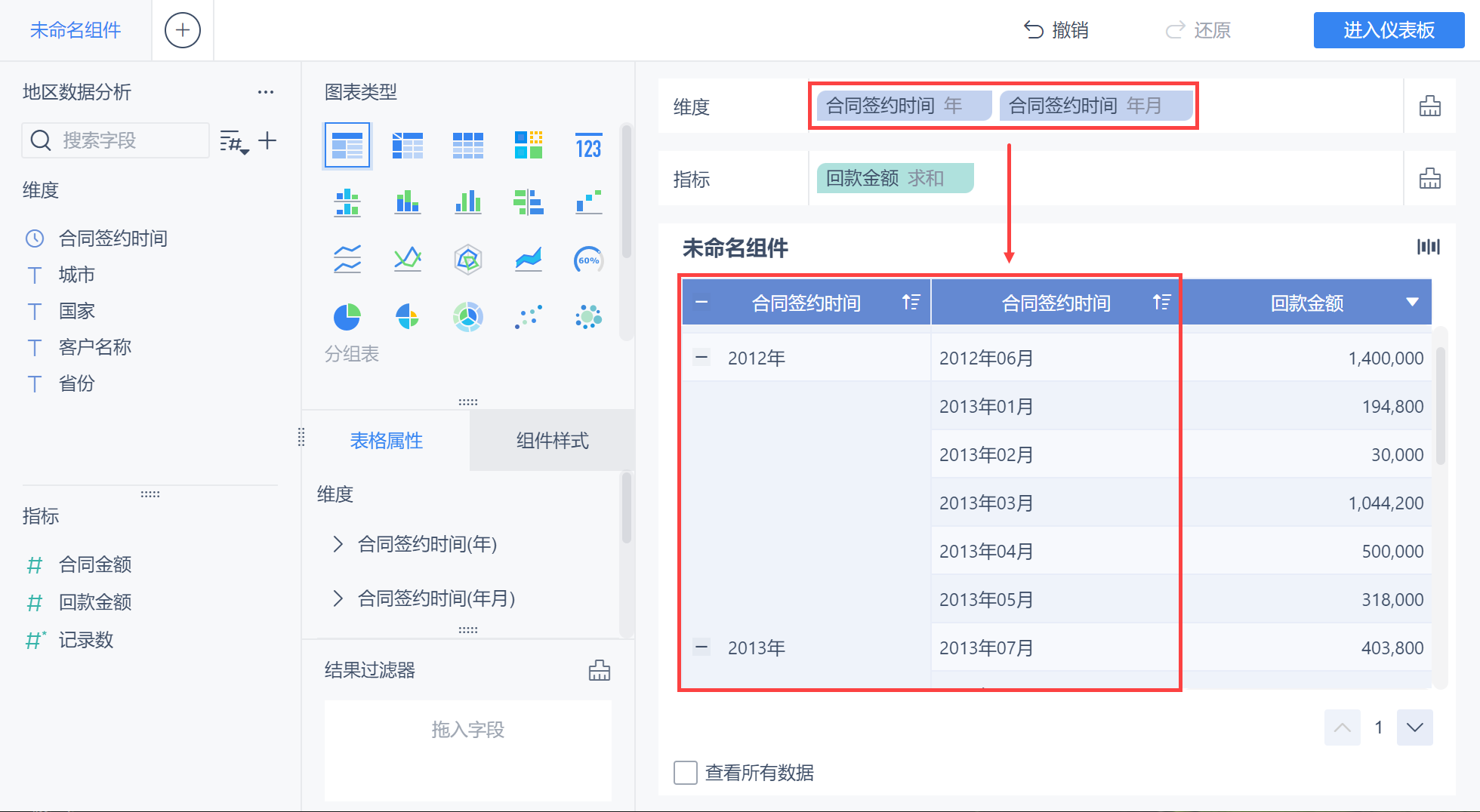 进入组件编辑界面,选择将「合同签约时间」字段拖入分析维度栏,「回款金额」拖入分析指标栏,如下图所示: