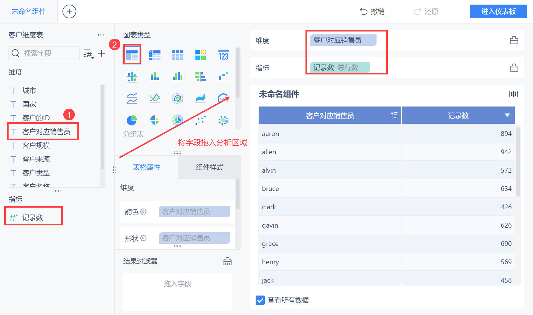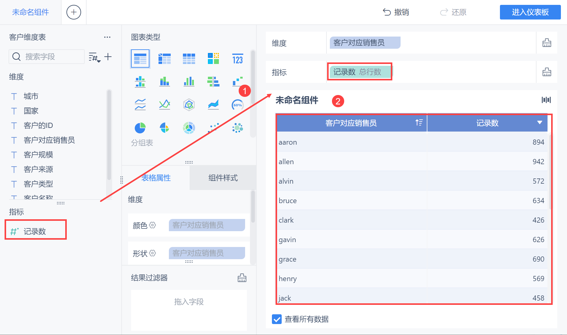 新建仪表板和组件后,进入组件编辑界面,在左侧的待分析区域指标下存在记录数字段。在组件的维度和指标中分别拖入「客户对应销售员」和「记录数」。