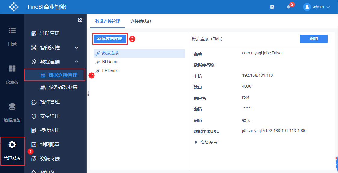 1)登录 FineBI ,选择「管理系统>数据连接」,点击「新建数据连接」。如下图所示:
