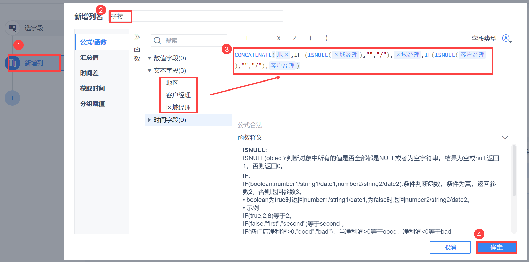 注:公式框中的函数、字段都需要点击左侧的选择区域选择,不能手动输入。