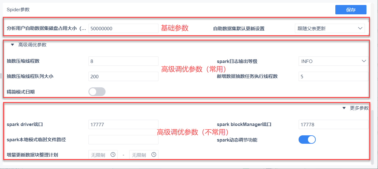 Spider 参数包含基础参数和高级调优参数,如下图所示: