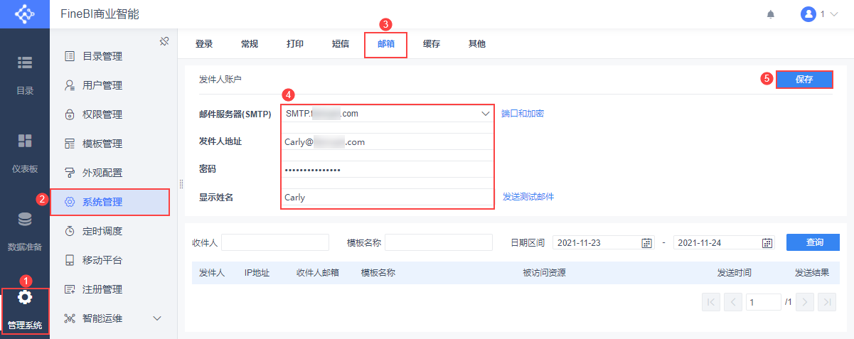 管理员登录数据决策系统,点击「管理系统>系统管理>邮箱」,配置发件人账户,点击「保存」,如下图所示: