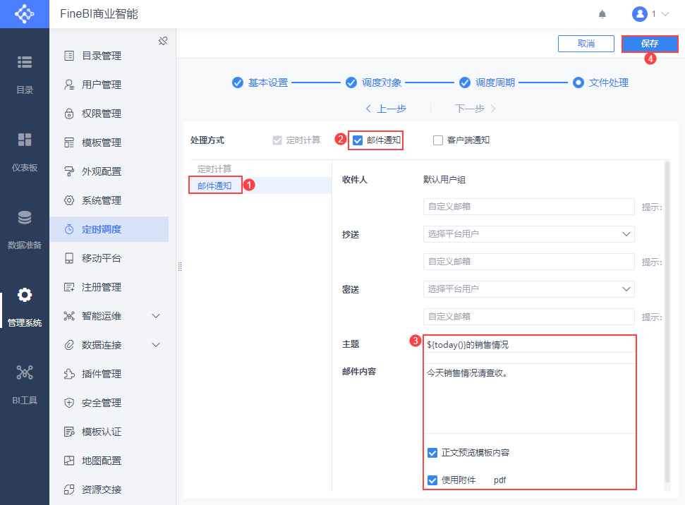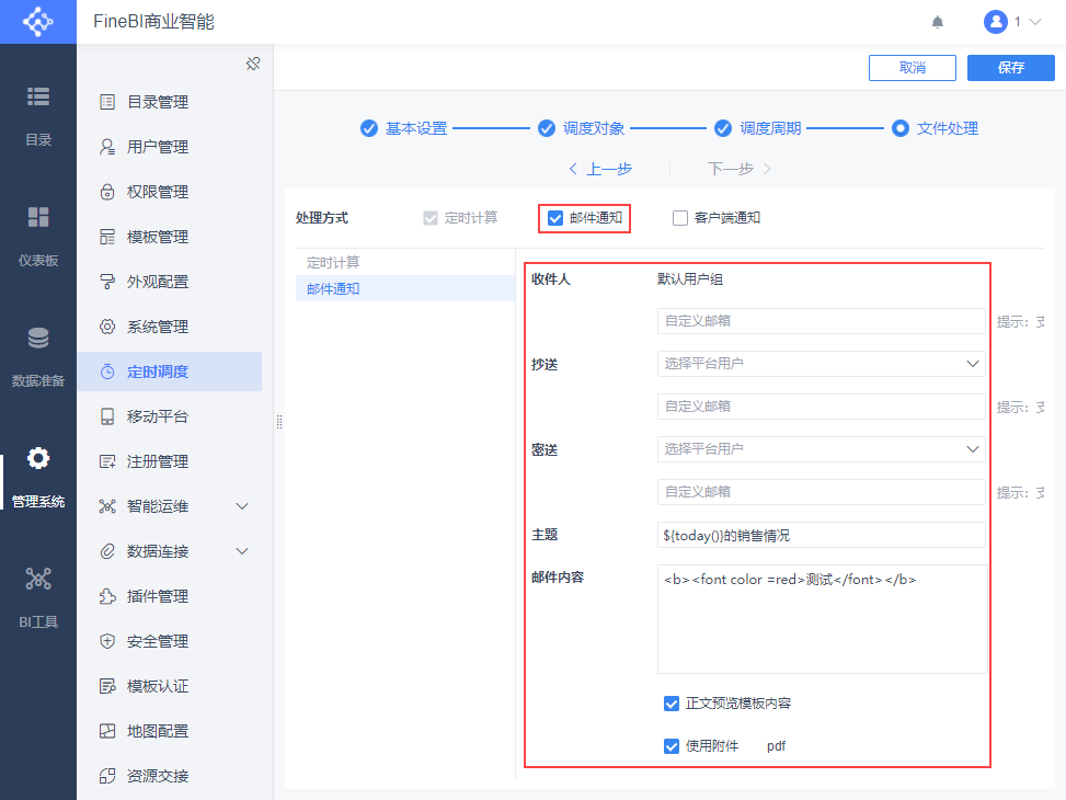 注:调度对象步骤中「对象类型」若选择 FineReport 报表模板,请参考 定时任务发送邮件