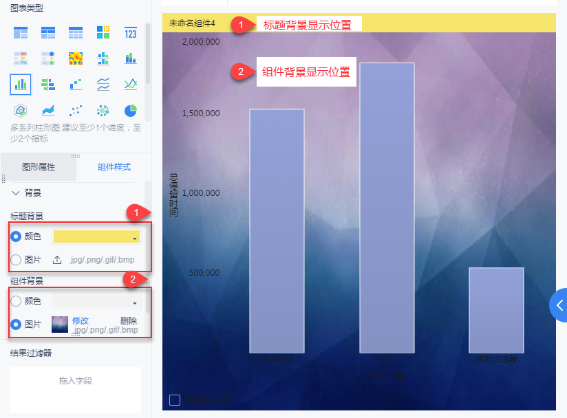用户可以对「标题背景」和「组件背景」进行替换,用户可以选择「颜色」(可选择透明)或上传组件的背景「图片」。